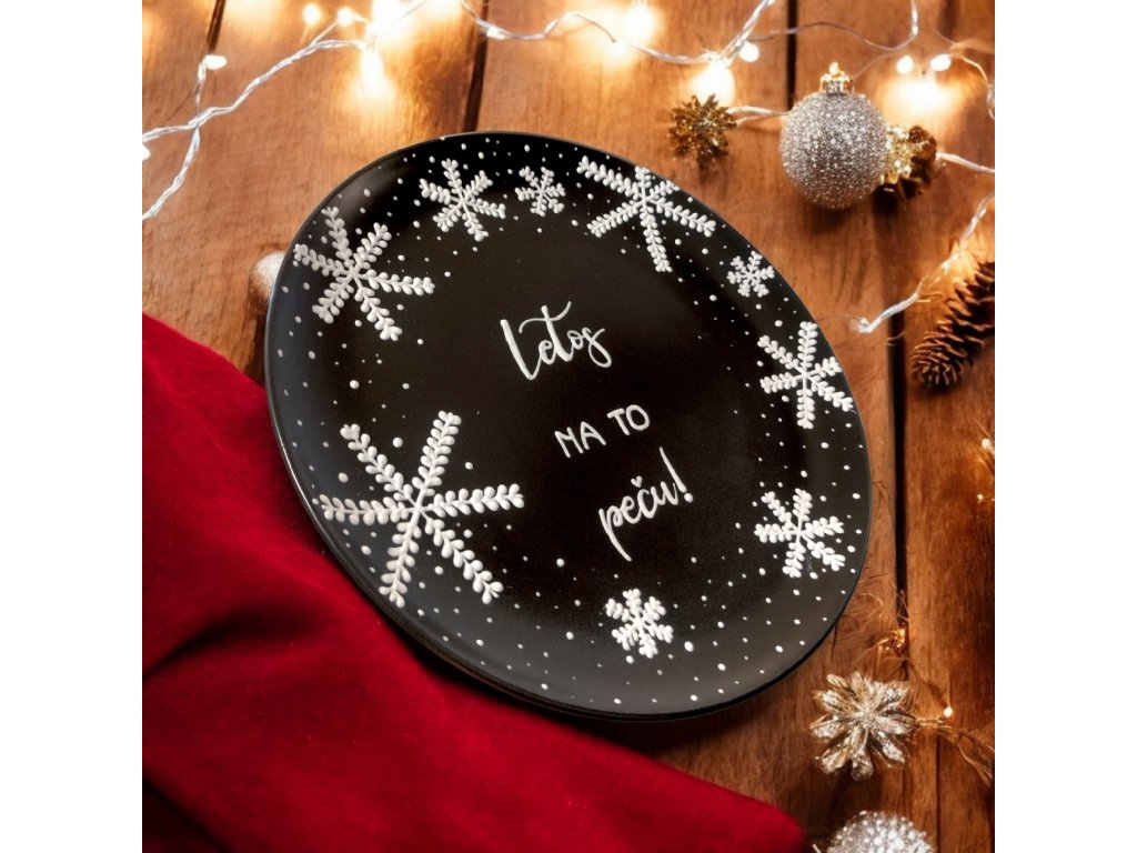 Elegantní ručně malovaný talíř z kameniny v tmavě šedé barvě přinese sváteční atmosféru. Talíř o průměru 26 cm je ozdoben jemnými sněhovými vločkami, malovanými ručně po okrajích, a vtipným nápisem „Letos na to peču!“, který přidá špetku humoru do vašeho domova.
