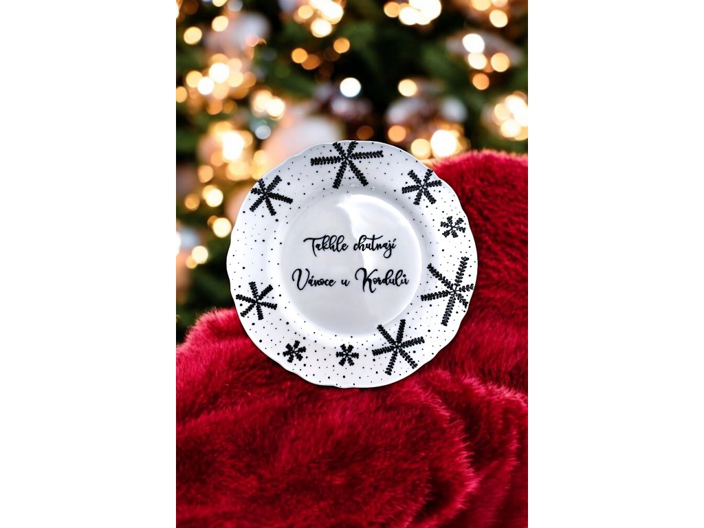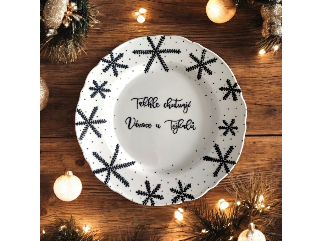 Tento exkluzivní talíř s názvem "TAKHLE CHUTNAJÍ VÁNOCE U (doplň si jméno sám)" je dokonale ručně malovaný a zdobený nádhernými sněhovými vločkami.