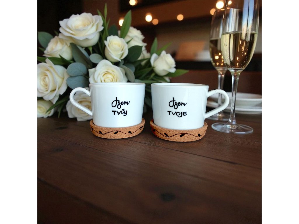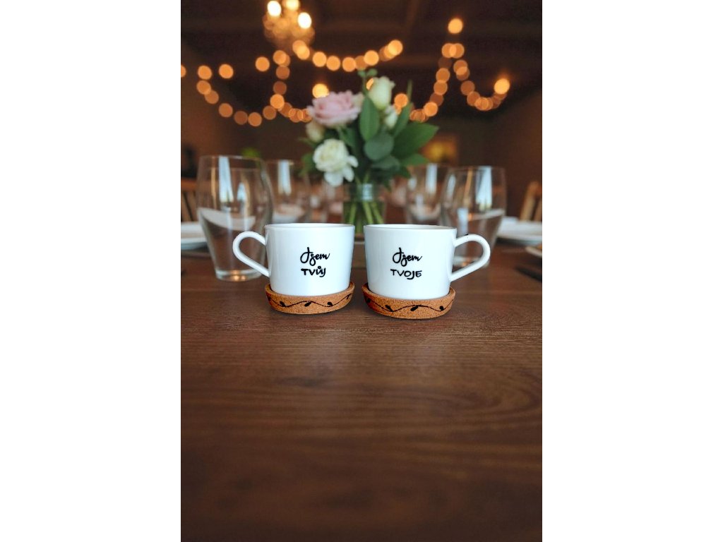 Sada obsahuje: 2 hrníčky + 2 dřevěné podtácky
