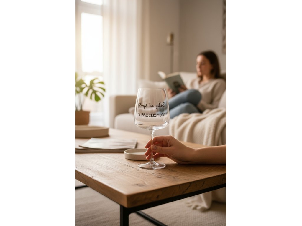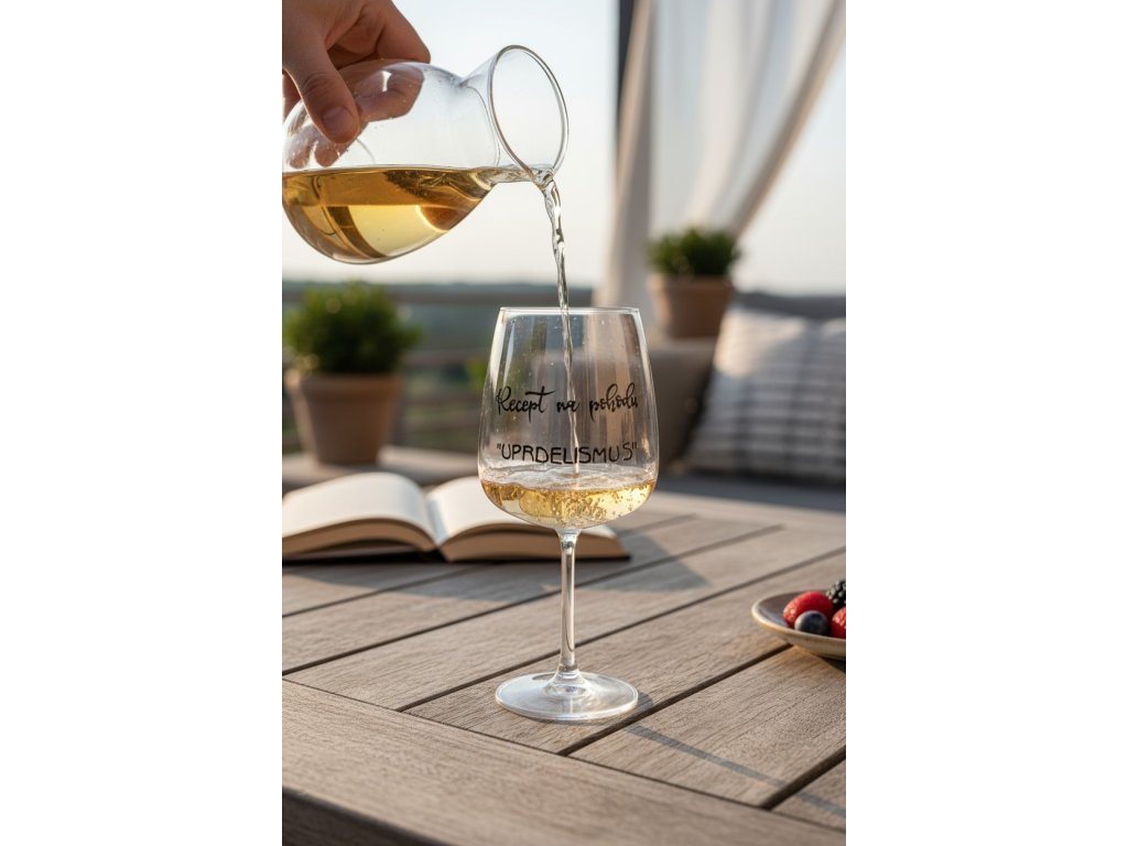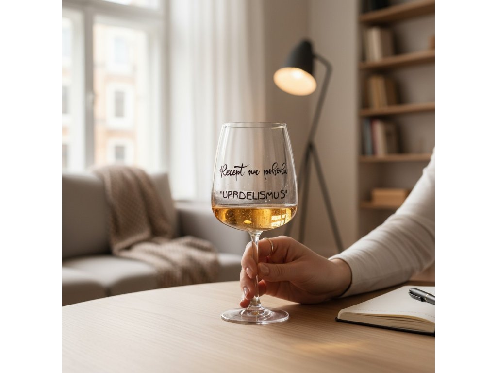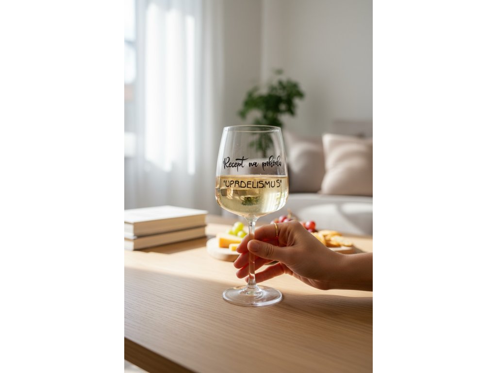 Ručně malovaná sklenice na víno s nápisem „Recept na pohodu: UPRDELISMUS“ je ideálním dárkem pro všechny, kdo si chtějí užít chvíle klidu a pohody s nadhledem. Sklenice má elegantní a moderní design, doplněný ručním nápisem, který s humorem připomíná důležitost životního nadhledu. Je ideální pro vánoční nebo jiné slavnostní chvíle a vnese úsměv na tvář každému, kdo ji dostane.