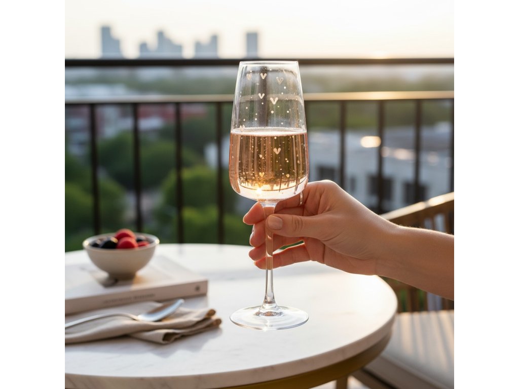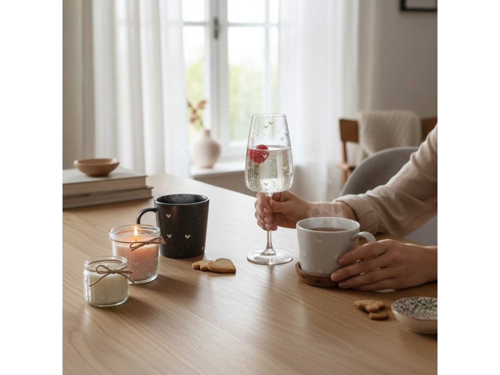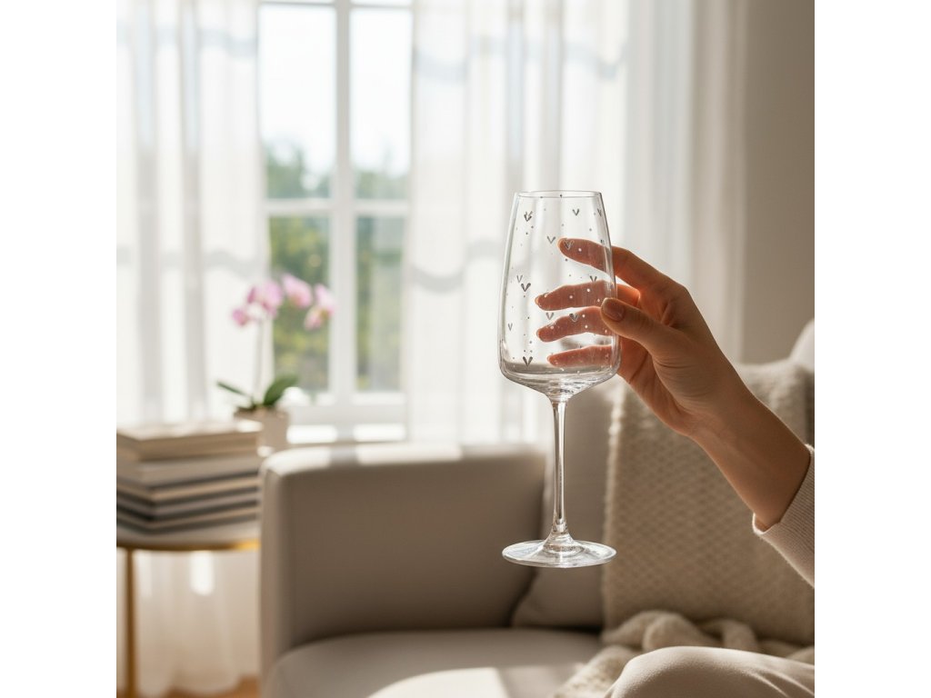 Užijte si chvíle odpočinku po náročném dni s naší elegantní sklenicí na víno nebo sekt. Ručně malovaný design s motivem srdce a teček přináší do každého doušku lásku a harmonii. Ideální pro romantické večery ve dvou či společenské setkání s přáteli.