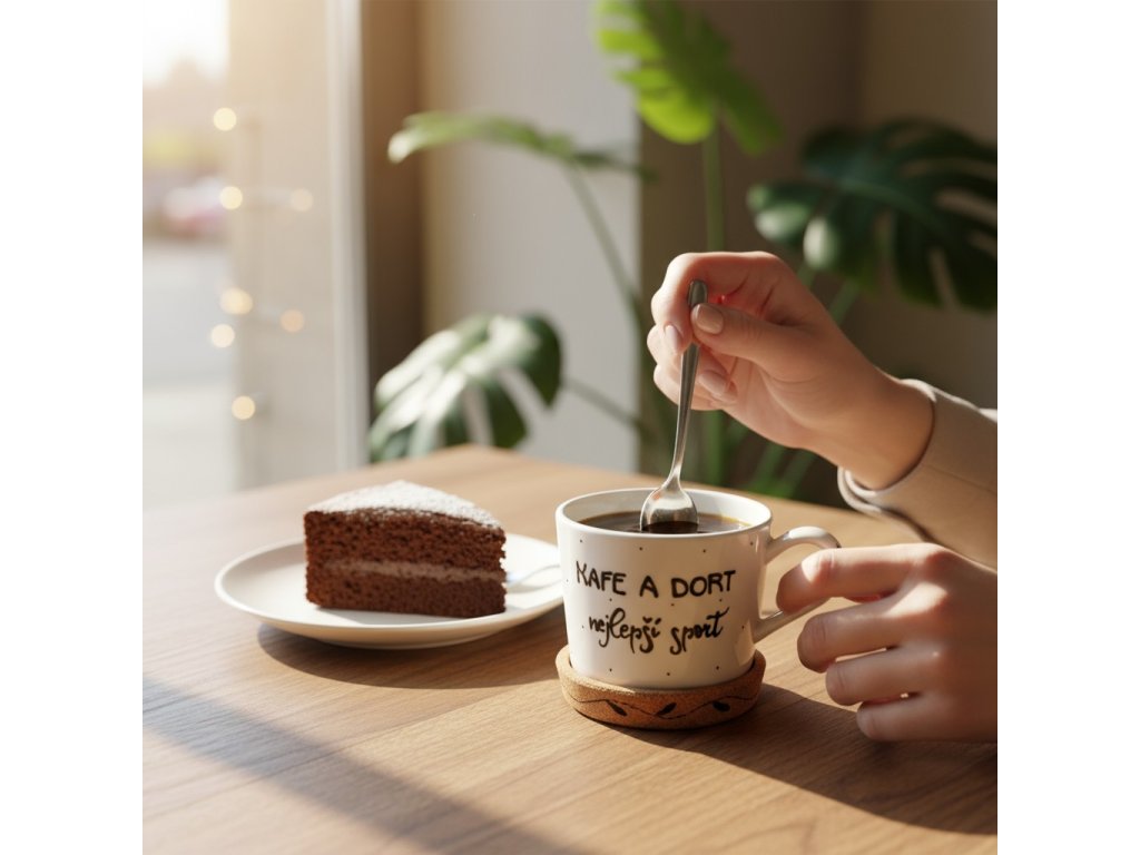 Jemný Design: Hrnek je zdoben nápisem "Kafe a dort, nejlepší sport", který dodává hrníčku sentimentální hodnotu a osobní dotek.