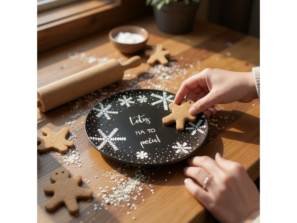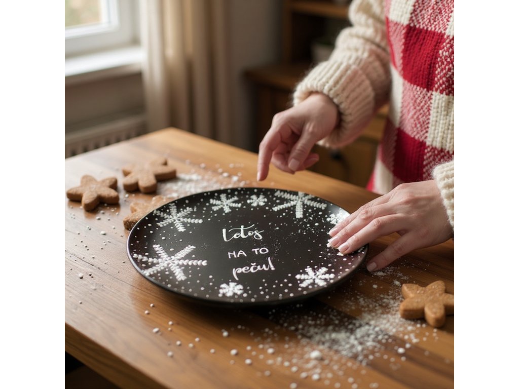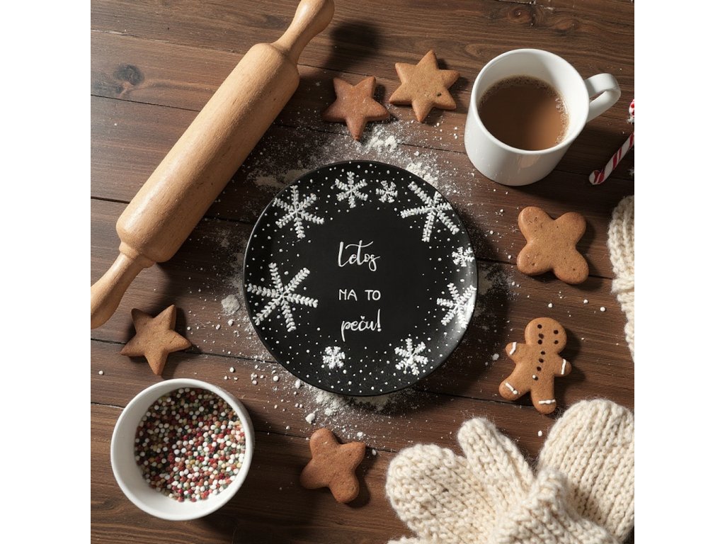 Elegantní ručně malovaný talíř z kameniny v tmavě šedé barvě přinese sváteční atmosféru na váš stůl. Talíř o průměru 26 cm je ozdoben jemnými sněhovými vločkami, malovanými ručně po okrajích, a vtipným nápisem „Letos na to peču!“, který přidá špetku humoru do vašeho stolování.